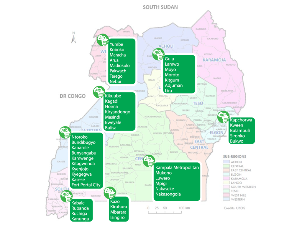 Districts of Ntoroko, Bundibugyo, Kabarole, Bunyangabu,Kamwenge, Kitagwenda, Kyenjojo, Kyegegwa, Kasese and Fort Portal City.